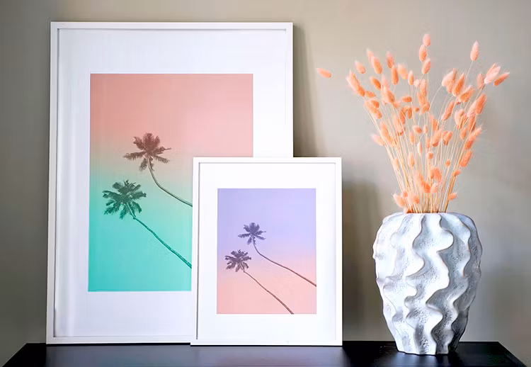 Artwork med vit kant som ramar in fint. Här finner du ett tropiskt motiv med två palmer som söker sig mot himmelen. Här framställs palmerna i en tvåtonad bakgrund som går i grönt och persikofärg. Färgkombinationen med grönt som basfärg smälter smidigt in i rummet och ger rummet lite extra energi. Ställer sig fint i alla typ av rum, ensam på en vägg eller tillsammans med andra fina tropiska motiv.