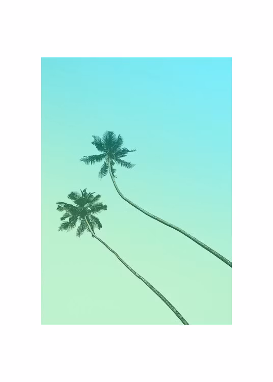 Artwork med vit kant som ramar in fint. Här finner du ett tropiskt motiv med två palmer som söker sig mot himmelen. Här ser du palmerna med en turkos och ljusgrön bakgrund, kulörer som ofta dyker upp i uppfriskande sammanhang som spa- och poolmiljöer. Klä din vägg i en sval ton för harmoni och balans. Ställer sig fint i alla typ av rum, ensam på en vägg eller tillsammans med andra fina tropiska motiv.