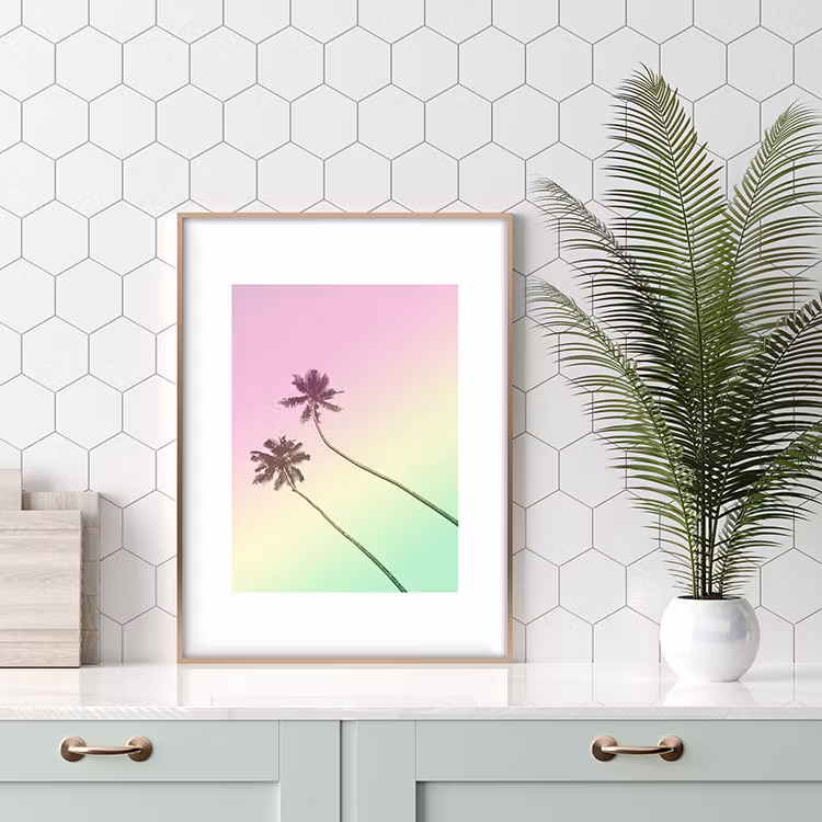 Artwork med vit kant som ramar in fint. Här finner du ett tropiskt motiv med två palmer som söker sig mot himmelen. Våga ta ut svängarna och fyll rummet med fräscha pastellfärger. Ett färglöst rum kan enkelt livas upp med tre nyanser i ett svep. Ställer sig fint i alla typ av rum, ensam på en vägg eller tillsammans med andra fina tropiska motiv.