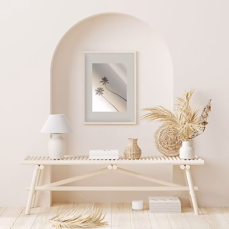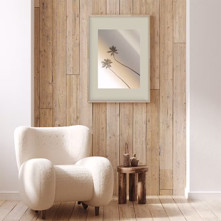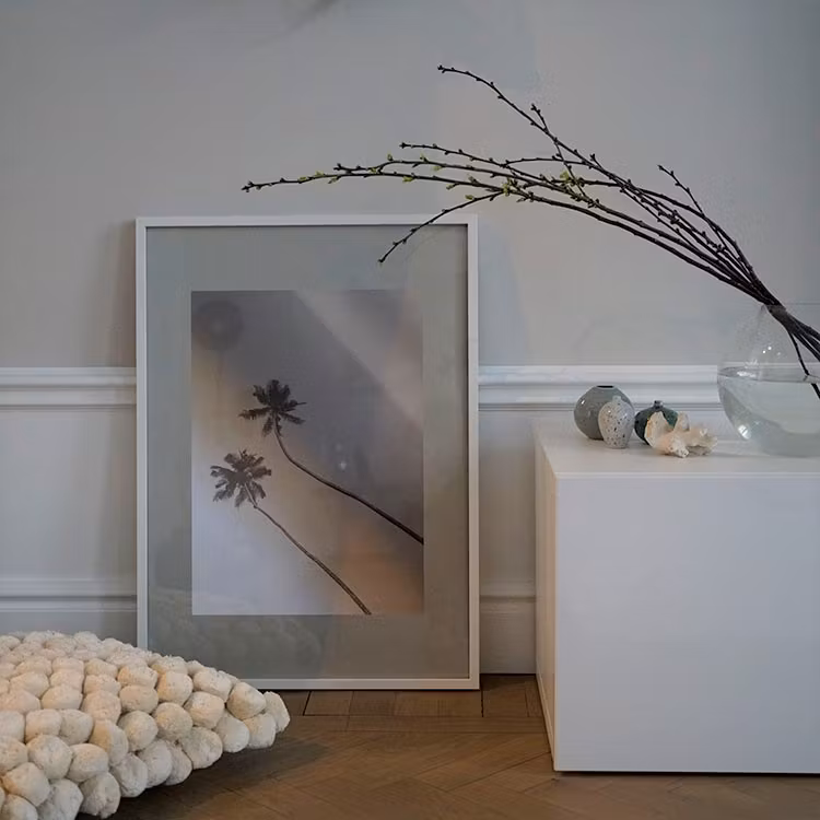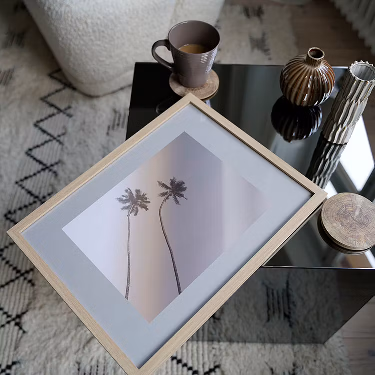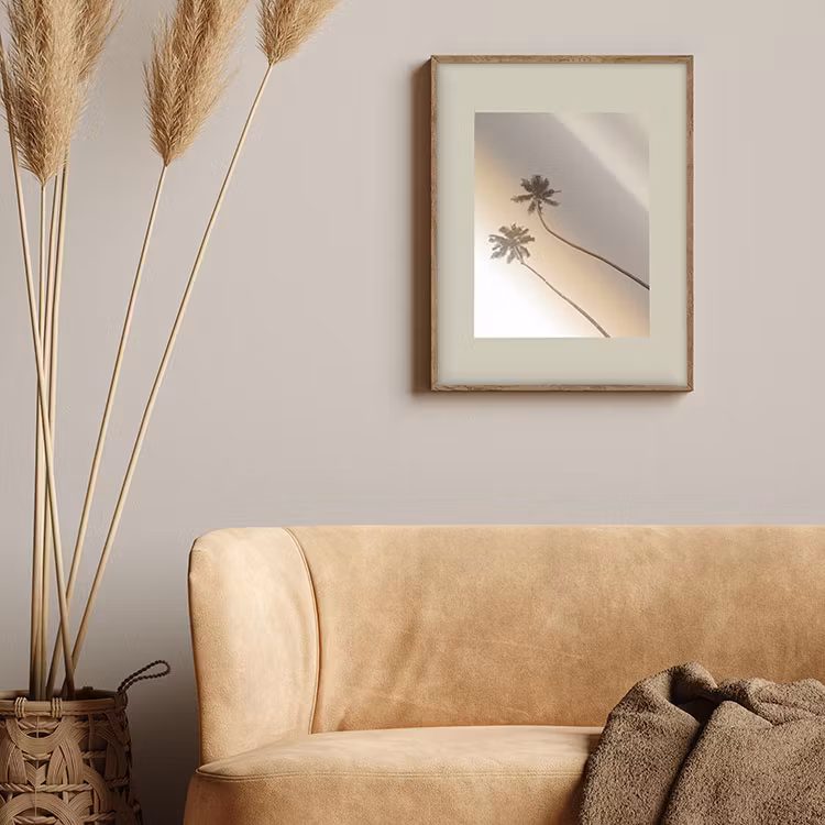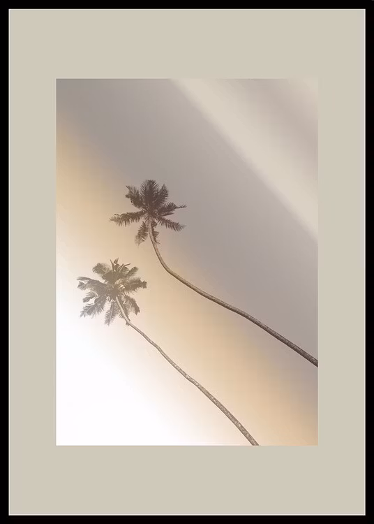 Artwork med beige kant som ramar in fint. Här finner du ett tropiskt motiv med två palmer som söker sig mot himmelen. Motivet återger palmerna i dova och neutrala nyanser som ger ro och är nollställande. Ställer sig fint i alla typ av rum, ensam på en vägg eller tillsammans med andra fina tropiska motiv.