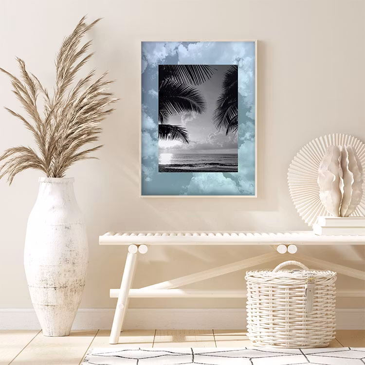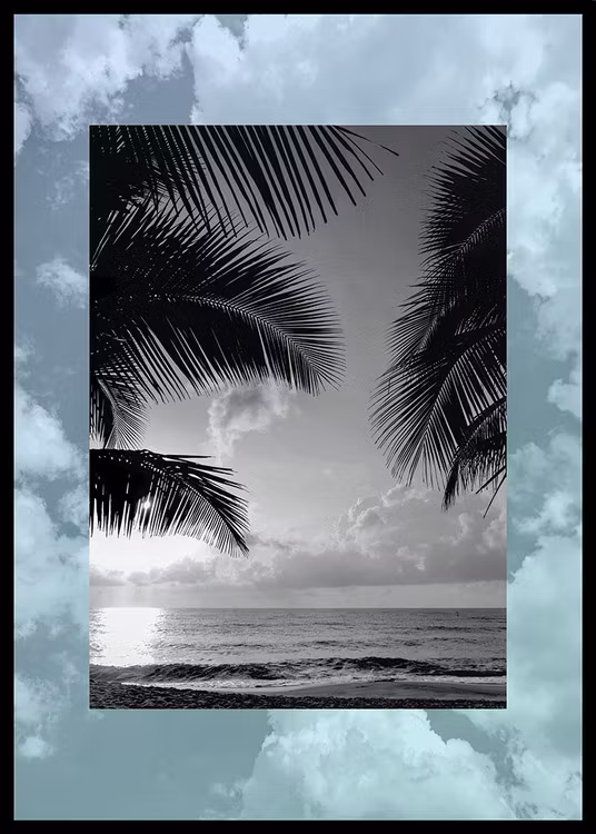 Artwork med ljusblå kant i moln som ramar in fint och ger en himmelsk känsla. I detta motiv ser vi palmblad som öppnar upp mot himmelen och havet. Motivet går i svartvita toner för att ge ett stilrent och stillande intryck. Ställer sig fint i alla typ av rum, ensam på en vägg eller tillsammans med andra fina tropiska motiv.