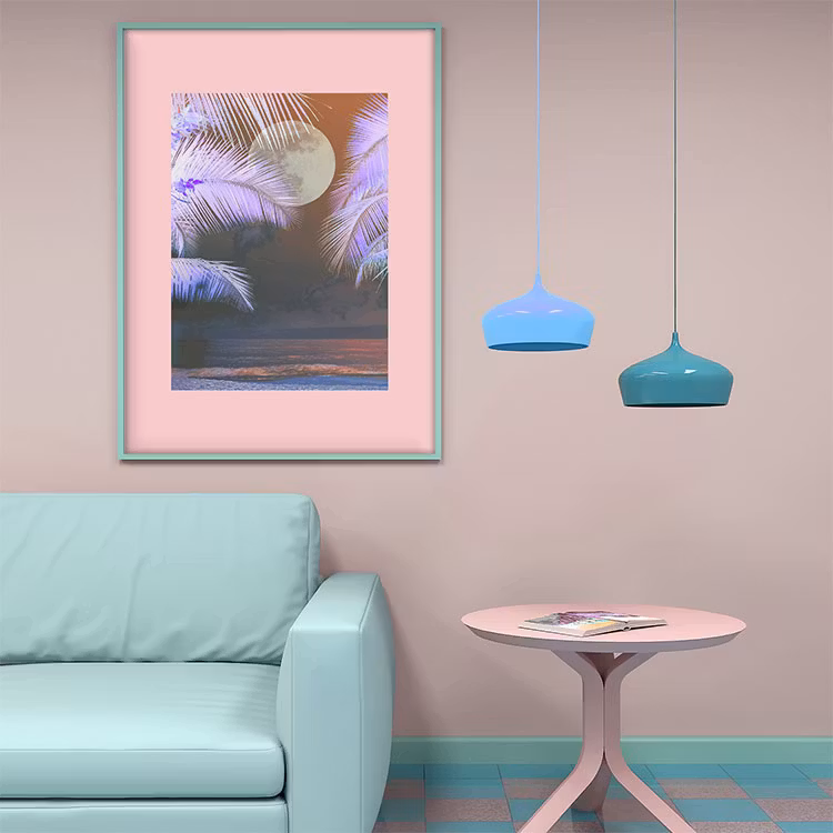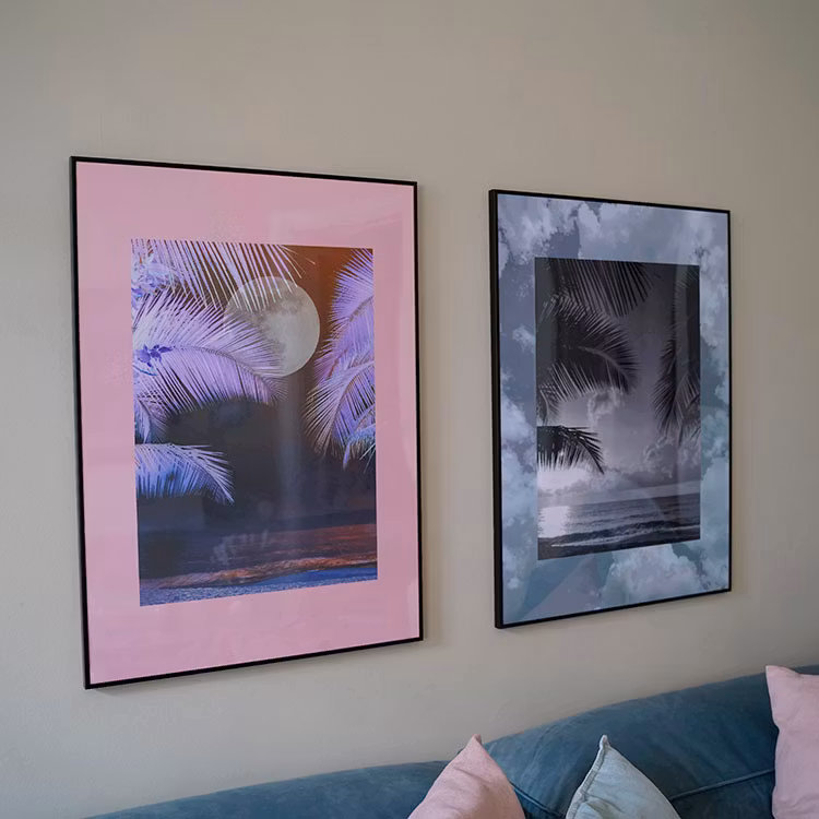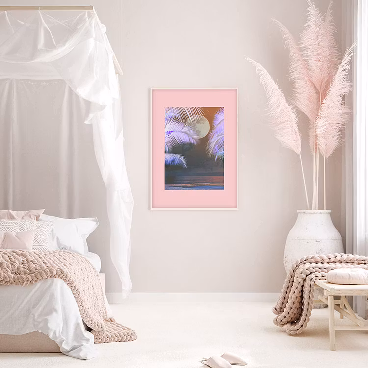 Artwork med rosa kant som ramar in fint. I detta motiv ser vi palmblad som öppnar upp mot himmelen och havet. Motivet återges i dova toner där månen lyser upp fint i en förtrollande miljö. Ställer sig fint i alla typ av rum, ensam på en vägg eller tillsammans med andra fina tropiska motiv.