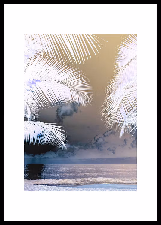 Artwork med vit kant som ramar in fint. I detta motiv ser vi palmblad som öppnar upp mot himmelen och havet. Motivet återges i dova toner med känsla av mystik i en förtrollande miljö. Ställer sig fint i alla typ av rum, ensam på en vägg eller tillsammans med andra fina tropiska motiv.
